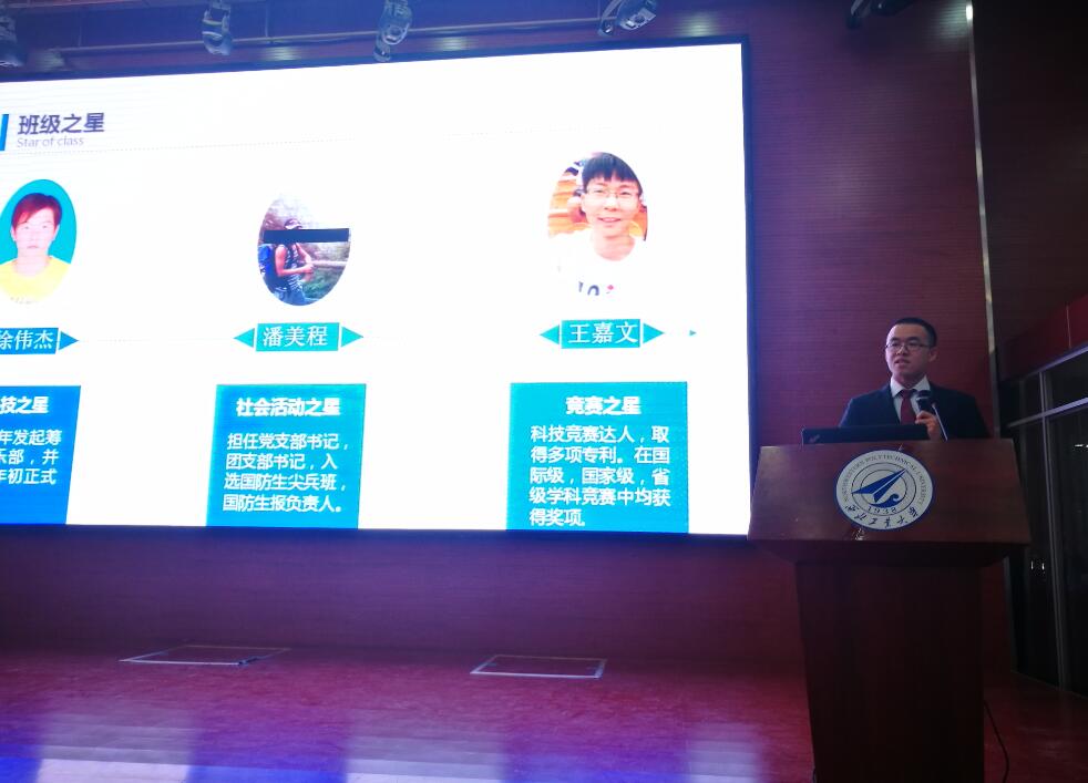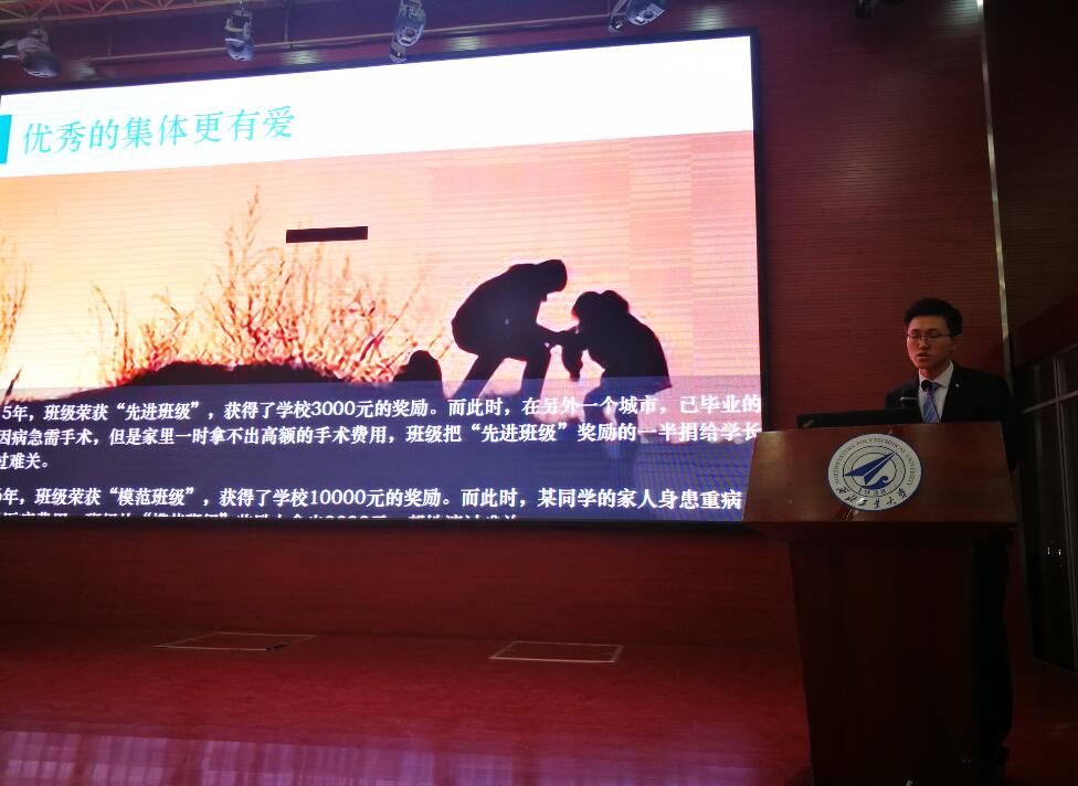 隆重的颁奖仪式后,罗麦奖学金获奖代表,模范班级代表和优秀研究生代表分别上台分享一年来的成长成才历程。2014级本科生王培栋分享了他在学科专业、科技竞赛、时间管理等方面的成绩及经验,并以自己暑期留校在航模队准备全国比赛的艰辛事迹为例告诉同学们,“珍惜大学时光,成功是留给追赶时间的人的”,“有些事不一定喜欢了才去做,可能做了才会喜欢”。校模范班级02011301班团支书潘美程代表班级进行了故事分享。他从思政建设、班级建设、社会活动三个方面对班级进行了简要介绍,并以班级科技创新、学业拔尖的同学为例,详细介绍了他们的事迹。他指出,班级是一个整体,每个人都可以带头前进,唯有各司其职,工作才能有序有效开展。2014级研究生代表戴存喜分享了他的成长经历。他从班级建设、党团建设两方面对班级工作进行了简要介绍,并讲述了班级内部捐款资助班里困难同学渡过难关的故事。他指出,但行好事,莫问前程,作为班级干部和党员,应恪尽职守,服务同学,并积极提升自我,严格要求自己,起到党员的带头模范作用。