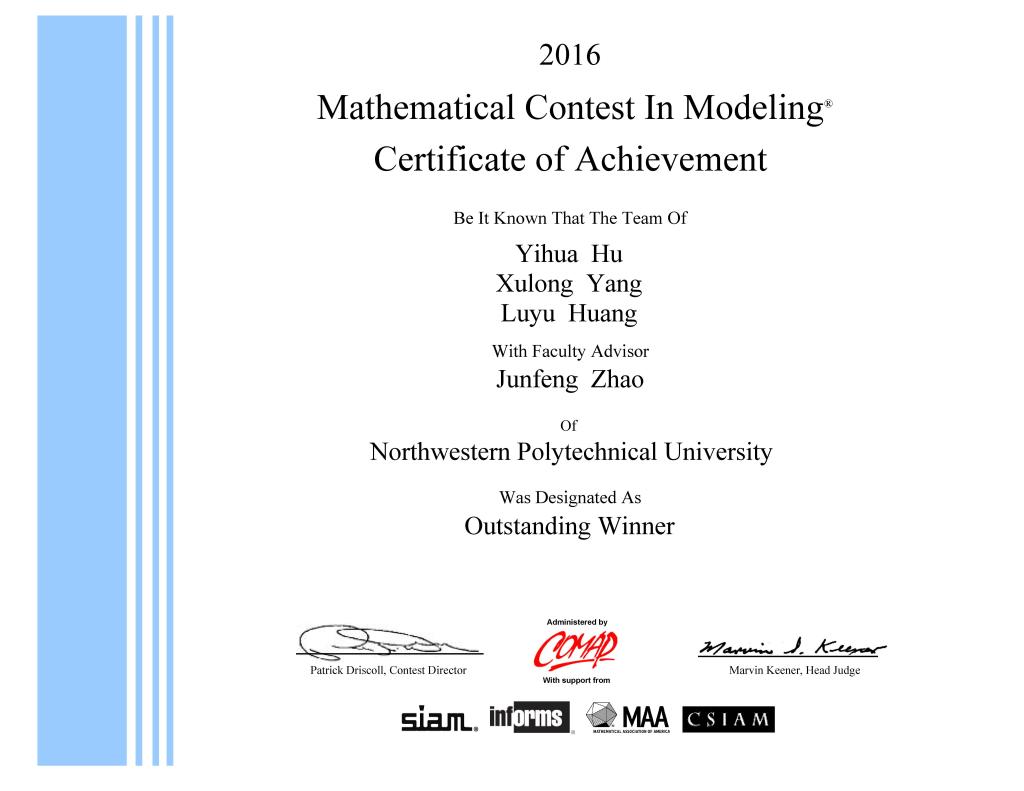 杨旭龙、黄鲁豫同学2016年国际数学建模竞赛特等奖证书